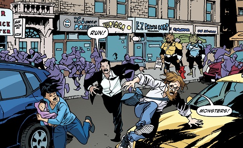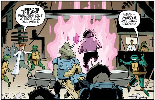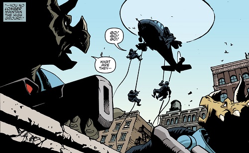 Les dinosaures lancèrent une offensive conséquente dans les rues de New York (TMNT #78). L’alliance entre Bishop et le Foot Clan avait pour but d’arrêter les envahisseurs. Splinter comptait s’attaquer au centre de commande de Zom, repliée dans une église. Les tortues eurent l’information de Jennika, qui reconnaissait que Splinter allait trop loin et leur permit d’intervenir à temps (TMNT #79). N’ayant d’autres choix, les tortues durent se battr, aux côtés des triceratons contre le clan de leur père. Zom affronta elle-même Splinter, certaine de la victoire. Le rat retourna la situation, profitant de son agilité et soufflant une poudre paralysante au visage du triceraton. Sur le point de l’exécuter, Michelangelo l’arrêta et s’interposa. Donatello avait un plan et attendait qu’April les téléporte. Ma’Riell avait donné son accord pour accueillir ce qu’il restait des triceratons sur Burnow Island. Splinter se trompait, il existait bien une solution sans risques pour éviter l’invasion de la Terre. Zom, fatiguée de la guerre, accepta ce compromis et partit avec les siens pour Burnow Island (TMNT #80).